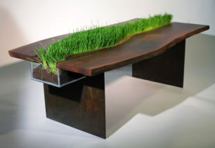 Другой вариант предложила художница Эмили Веттштейн. Дизайнер не использовала огромные травяные пространства, но дополнила обычный деревянный стол необычного вида прозрачной травяной «лентой». Кажется, что молодая поросль буквально расколола надвое деревянное пространство. Красивый, стильный и очень экологичный на вид, стол несет мощный посыл, демонстрируя непревзойденную силу жизни. Гармоничное сочетание в Planter завораживает, а прозрачный пластик контейнера позволяет наблюдать за ростом травы и развитием ее корней изо дня в день. Здесь уже не подойдет рулон газонной травы, но при желании можно посадить в контейнер что угодно, от цветов до ароматной зелени, украшающей обед как очарованием растений, так и приятным вкусом. Кроме газона, зона растений может стать цветочным садом, биологической лабораторией, да чем угодно на вкус владельца.